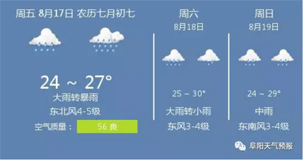 大雨转暴雨,温度 24 ~ 27℃,东北风4-5级,日出时间 05:41,日落时间 19:01。实时:气温 24℃,北风4级,湿度 94%,气压 1006 hPa。