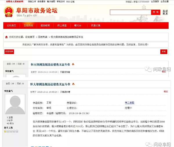 昨天,有市民向阜阳市政务论坛“百姓热线”反映,说恒大绿洲违规违法销售无证车位,具体内容如下: