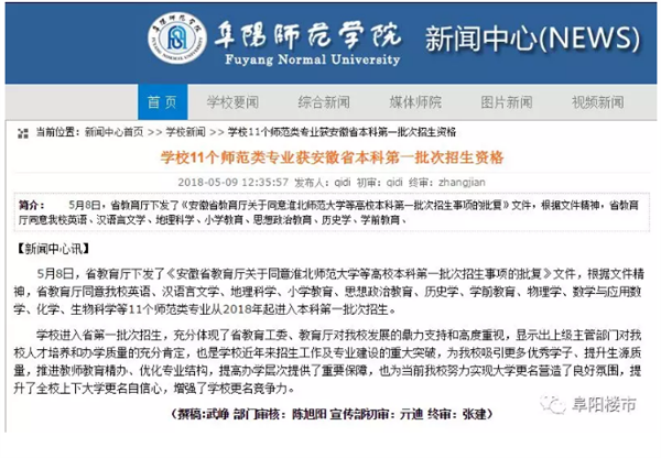 经过多轮论证,学校拟更名“阜阳师范大学”,目前创建大学各项工作稳步推进,学校已列入安徽省普通高等学校设置规划,并拿到了设置大学的“入场券”。